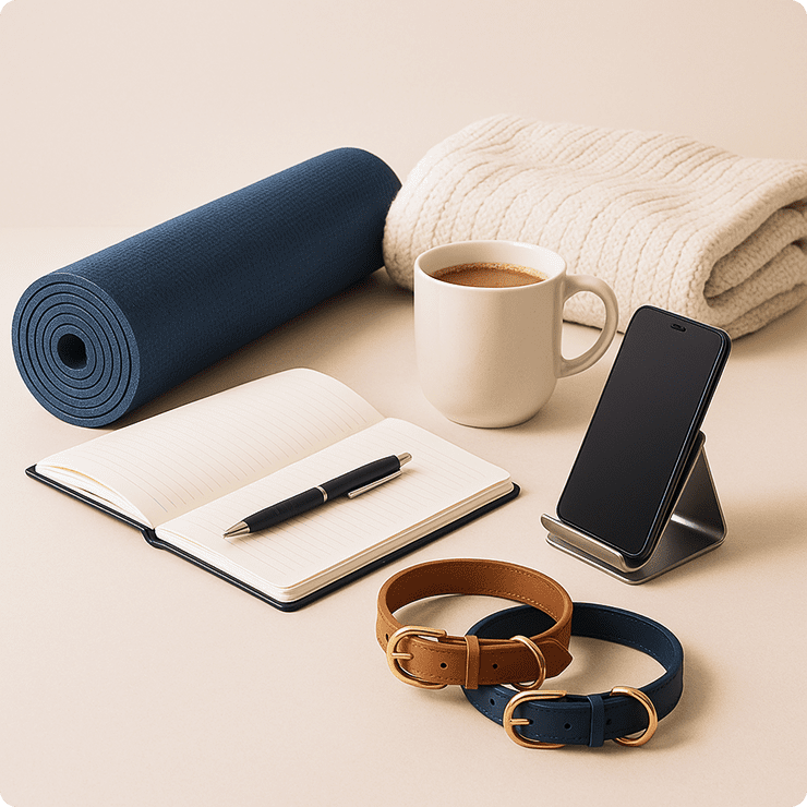 Everyday essentials and giftable items that make life easier and brighter—like yoga mats, notebooks, mugs, pet collars, a cozy throw blanket or a sleek phone stand.